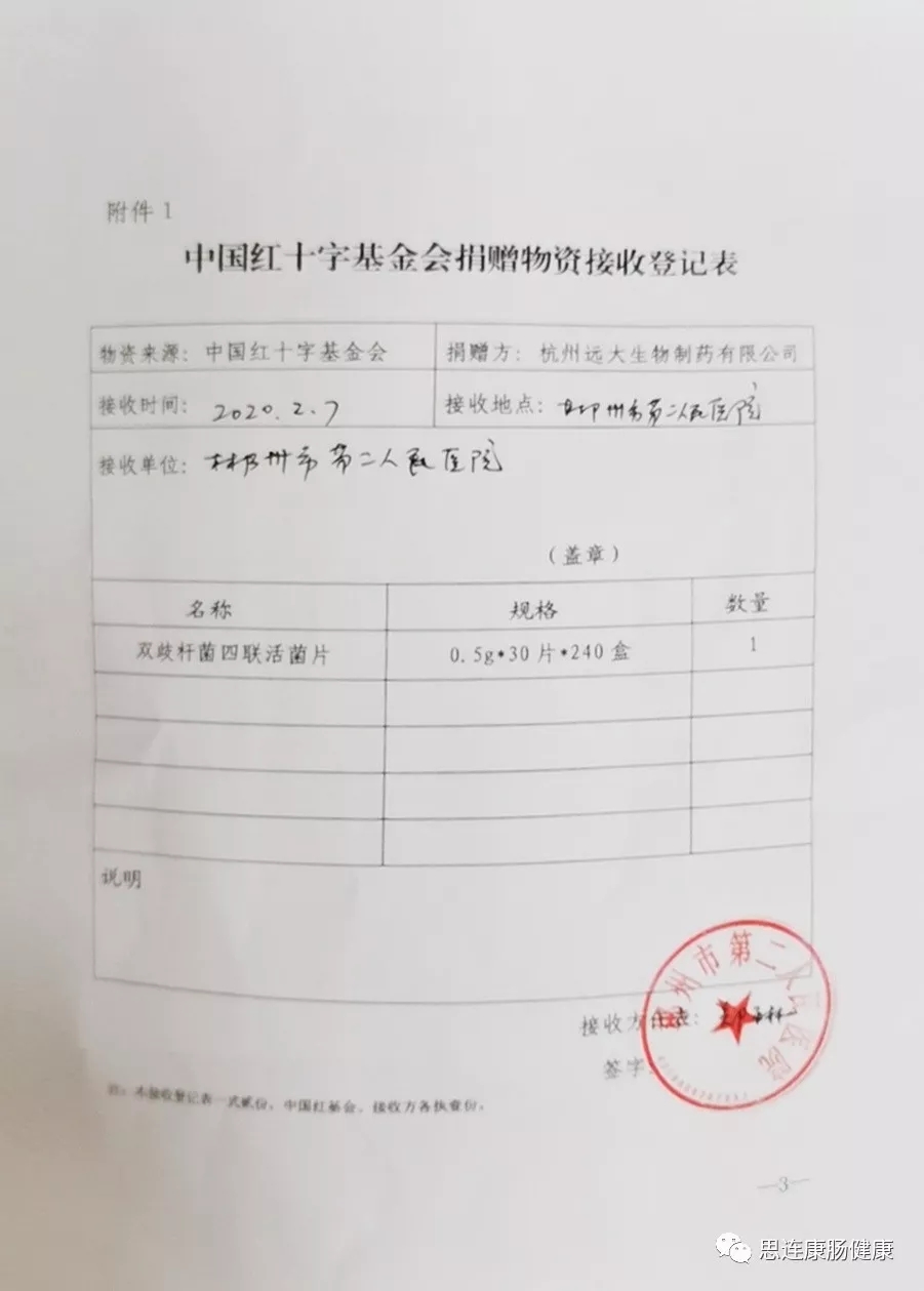 在得知防疫一線急需微生態(tài)藥品后,2020年2月6日,杭州遠大生物制藥有限公司立即啟動捐贈程序,決定第一批捐贈價值100萬元的雙歧桿菌四聯(lián)活菌片(思連康),專項用于疫區(qū)新型冠狀病毒肺炎的防治。目前第一批價值100萬元雙歧桿菌四聯(lián)活菌片(思連康)已全部送達湖北、浙江、湖南等地醫(yī)院;第二批價值130萬元的思連康(雙歧桿菌四聯(lián)活菌片)也已于昨日(2月12日)開始配送醫(yī)院。